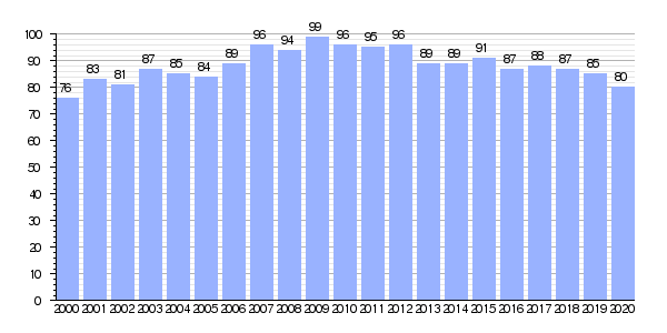 La siguiente gráfica muestra cómo ha cambiado el número de habitantes en A Moniña desde el año 2000 hasta el 2020. Puedes ver si la población ha crecido, disminuido o se ha mantenido estable.