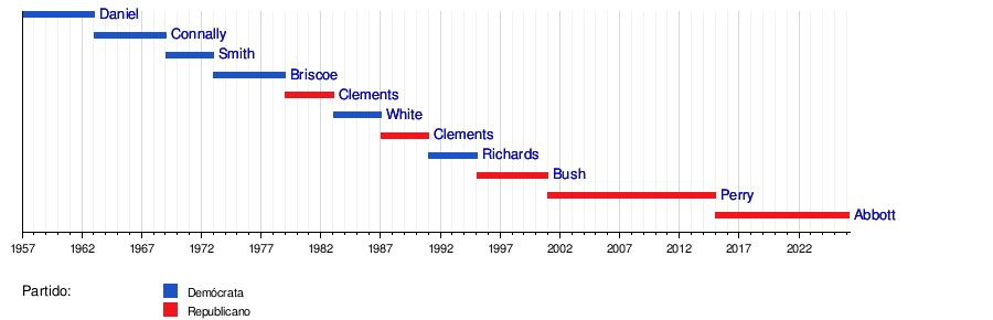 El gobernador actual, Greg Abbott, fue elegido en 2014. Ha sido reelegido en 2018 y en 2022. Es el segundo gobernador con más años en el cargo y se espera que cumpla 12 años para el 19 de enero de 2027.
