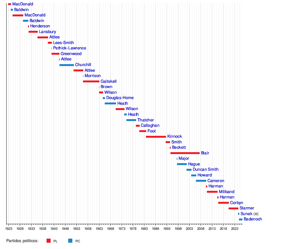 La tabla a continuación muestra a las personas que han sido Líderes de la Oposición en las dos Cámaras del Parlamento desde 1807. Antes de 1911, los líderes de ambas cámaras tenían el mismo estatus, a menos que uno de ellos fuera el Primer Ministro saliente del partido, quien entonces se consideraba el líder general. Después de 1911, el líder de la Cámara de los Comunes se convirtió en el líder principal.