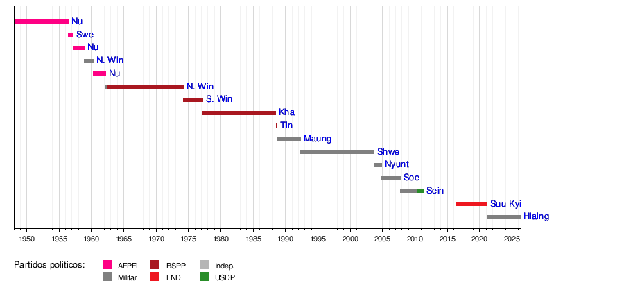 - Ne Win (1911–2002): Un líder militar que asumió el cargo de Primer Ministro en dos ocasiones. La primera fue del 29 de octubre de 1958 al 4 de abril de 1960. Su segundo periodo fue más largo, del 2 de marzo de 1962 al 4 de marzo de 1974, primero como militar y luego con el Partido del Programa Socialista de Birmania.