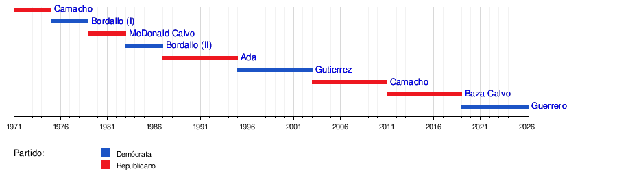 La gobernadora actual es Lou Leon Guerrero, del Partido Demócrata. Ella empezó su cargo el 7 de enero de 2019 y fue reelegida en las elecciones de 2022.
