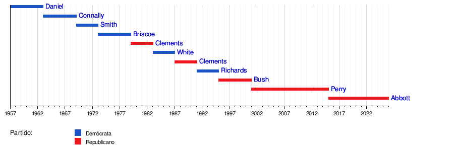 El gobernador actual, Greg Abbott, fue elegido en 2014. Ha sido reelegido en 2018 y en 2022. Es el segundo gobernador con más años en el cargo y se espera que cumpla 12 años para el 19 de enero de 2027.