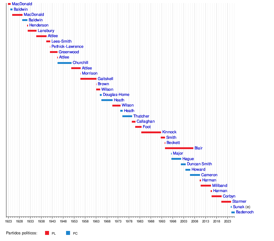 Kemi Badenoch Rishi Sunak Keir Starmer Jeremy Corbyn Harriet Harman Ed Miliband Harriet Harman David Cameron Michael Howard Ian Duncan Smith William Hague John Major Tony Blair Margaret Beckett John Smith (político británico) Neil Kinnock Michael Foot James Callaghan Margaret Thatcher Edward Heath Harold Wilson Edward Heath Alec Douglas-Home Harold Wilson George Brown Hugh Gaitskell Herbert Morrison Clement Attlee Winston Churchill Clement Attlee Arthur Greenwood Frederick Pethick-Lawrence Hastings Lees-Smith Clement Attlee George Lansbury Arthur Henderson Stanley Baldwin James Ramsay MacDonald Stanley Baldwin James Ramsay MacDonald