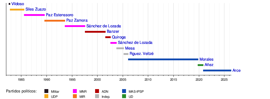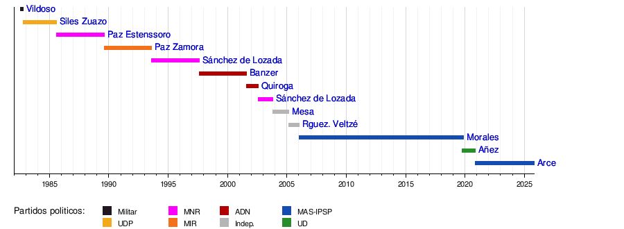 Esta línea de tiempo muestra los presidentes de Bolivia desde que el país volvió a ser una democracia en 1982, después de un período de gobiernos militares.
