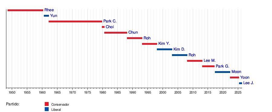 Hasta ahora, Corea del Sur ha tenido 14 presidentes principales. Además, ha habido 6 presidentes temporales, que suelen ser los primeros ministros en funciones.
