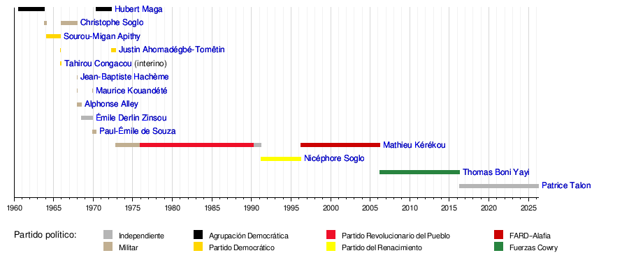 A lo largo de su historia, Benín ha tenido líderes de diferentes orígenes, incluyendo civiles y militares. La siguiente línea de tiempo muestra los períodos en que cada presidente estuvo en el cargo.