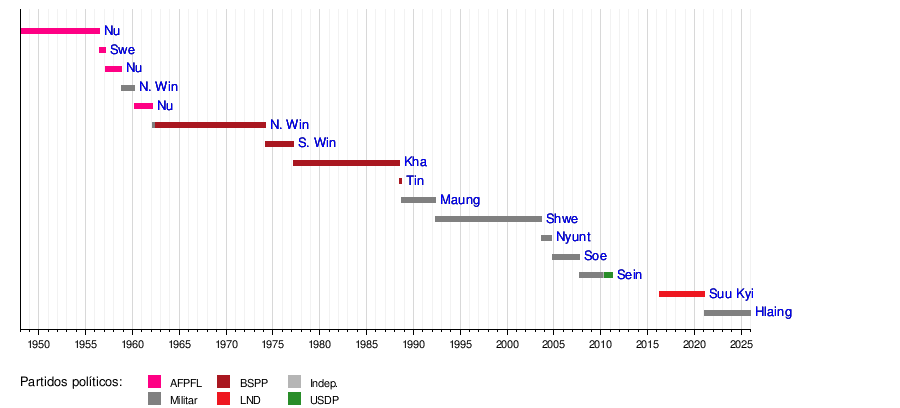 - Ne Win (1911–2002): Un líder militar que asumió el cargo de Primer Ministro en dos ocasiones. La primera fue del 29 de octubre de 1958 al 4 de abril de 1960. Su segundo periodo fue más largo, del 2 de marzo de 1962 al 4 de marzo de 1974, primero como militar y luego con el Partido del Programa Socialista de Birmania.