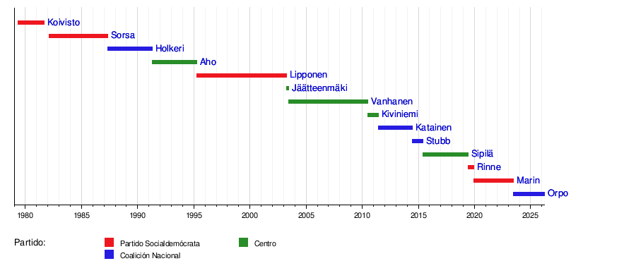 Esta línea de tiempo muestra cuándo estuvieron en el cargo los primeros ministros de Finlandia desde 1980, y a qué partido político pertenecían.
