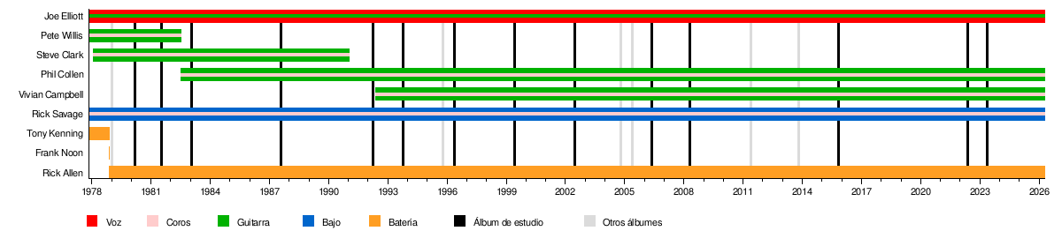 - Joe Elliott: voz, guitarra, teclado (1977-presente)