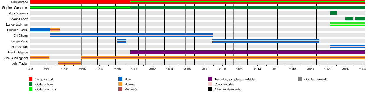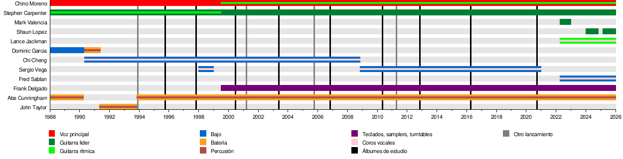 Los miembros actuales de Deftones son Chino Moreno (vocalista), Stephen Carpenter (guitarrista), Abe Cunningham (baterista) y Frank Delgado (quien usa samplers y teclados). El bajista original de la banda fue Chi Cheng. Lamentablemente, Chi sufrió un accidente en 2008 que lo dejó en un estado delicado y falleció en 2013.