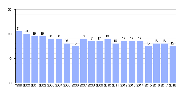 Si miramos los datos desde 1999, la población ha estado entre 15 y 21 habitantes. Por ejemplo, en 1999 había 21 personas, y en 2006 bajó a 15. Luego subió un poco y volvió a bajar.