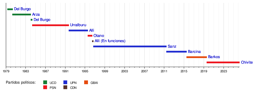 Esta línea de tiempo te muestra de forma visual quiénes han sido los presidentes y presidentas de Navarra desde 1979 y a qué partido político pertenecían.