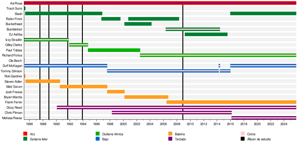 - Slash: guitarra principal (1985–1996, 2016-actualidad)