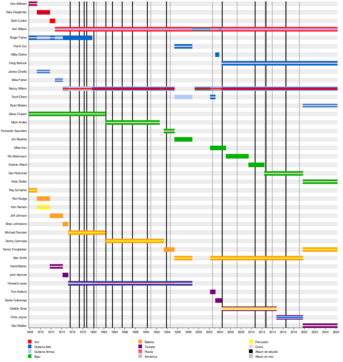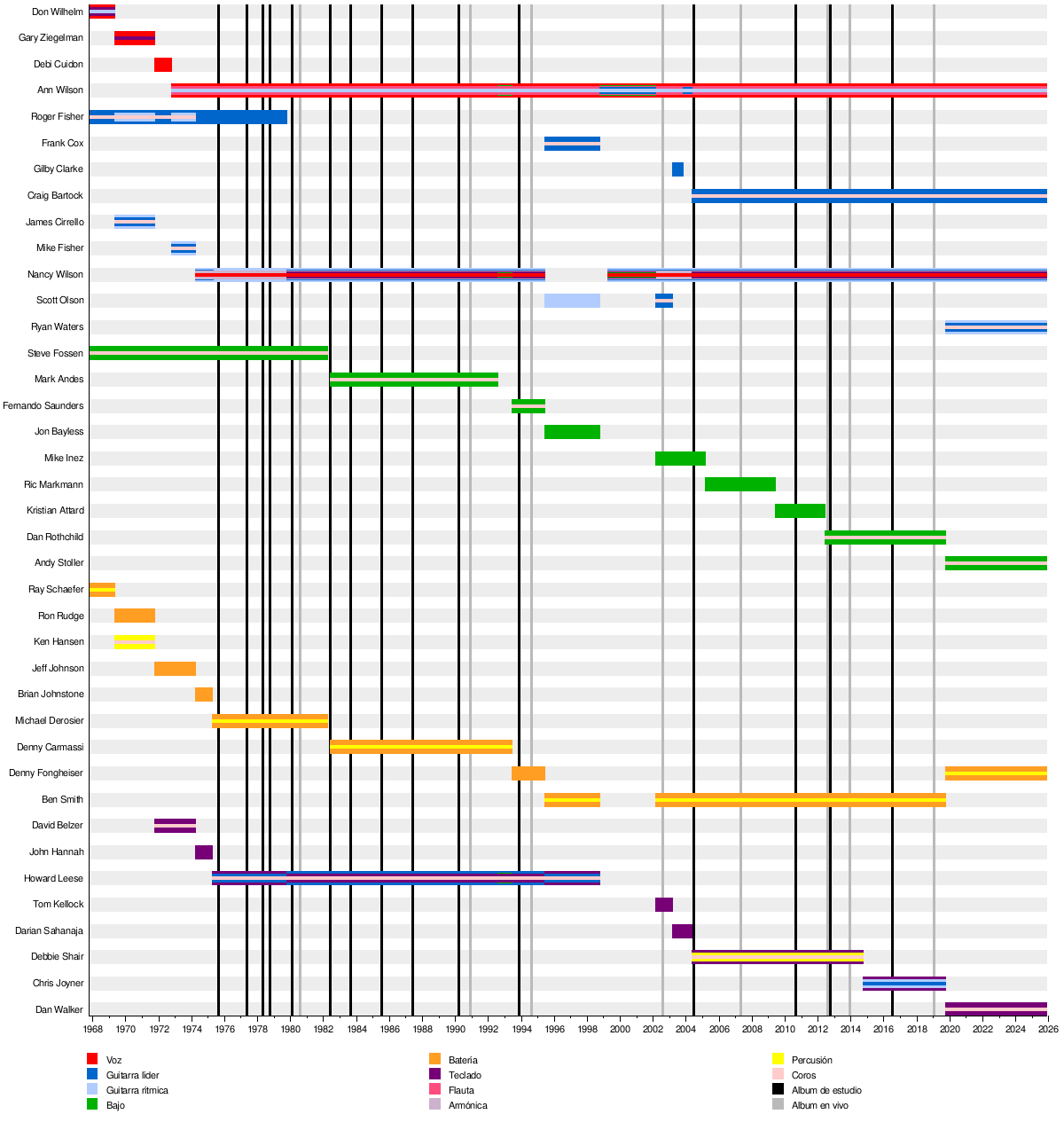 - Nancy Wilson - guitarras y coros (1975–1995, 2002–presente)