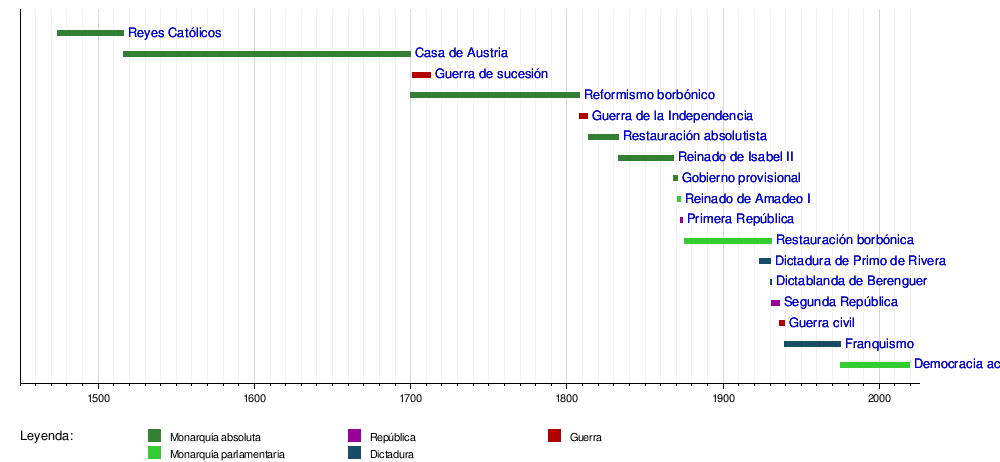 España democrática actual Dictadura de Francisco Franco Guerra civil española Segunda República española Dictablanda de Berenguer Dictadura de Primo de Rivera Restauración borbónica en España Primera República española Reinado de Amadeo I de España Gobierno provisional español 1868-1871 Reinado de Isabel II de España Reinado de Fernando VII de España Guerra de la Independencia española Reformismo borbónico Guerra de sucesión española Casa de Austria Reyes Católicos