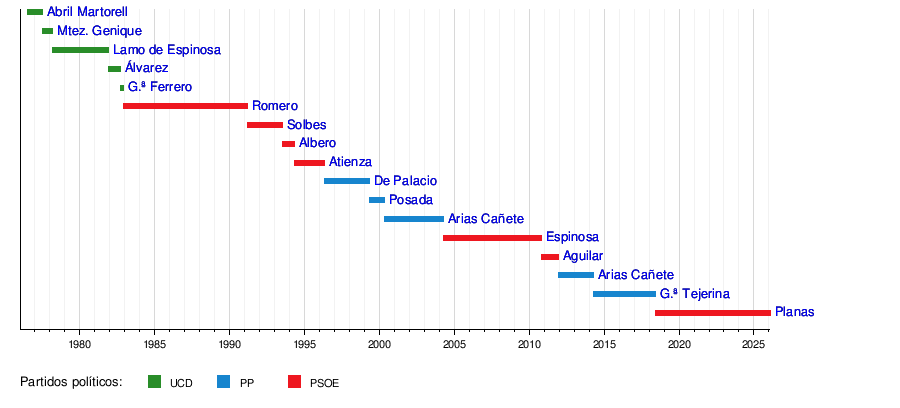 | Miguel Arias Cañete (7) | 22 de diciembre de 2011 | 28 de abril de 2014 | PP | Gobierno de Mariano Rajoy | |||