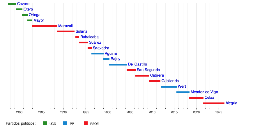 | Pilar del Castillo | 27 de abril de 2000 | 17 de abril de 2004 | PP | Se aprueba la Ley Orgánica de Calidad de la Educación, LOCE | ||||