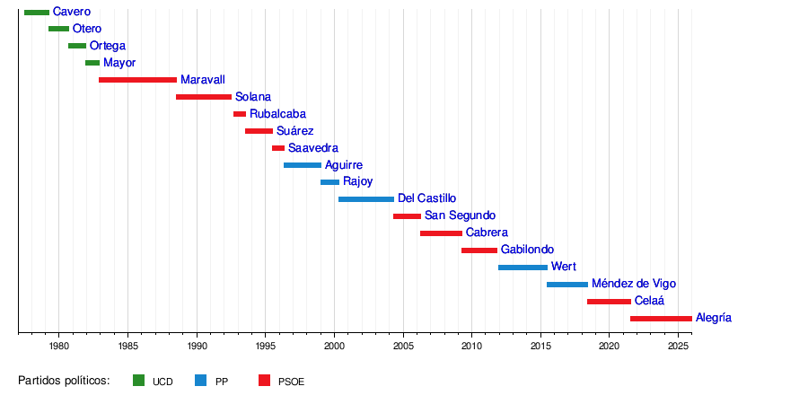 | Pilar del Castillo | 27 de abril de 2000 | 17 de abril de 2004 | PP | Se aprueba la Ley Orgánica de Calidad de la Educación, LOCE | ||||