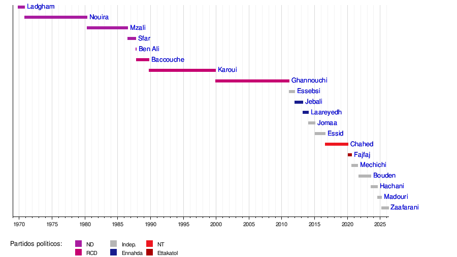 Esta línea de tiempo muestra quiénes han sido los Jefes de Gobierno de Túnez y a qué partido político pertenecían, desde 1969 hasta la fecha actual.
