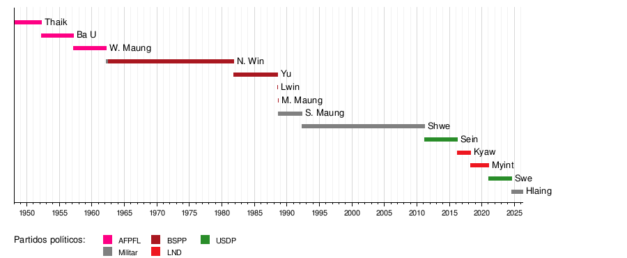 | 8.º | Thein Sein | 30 de marzo de 2011 | 30 de marzo de 2016 | USDP | ||