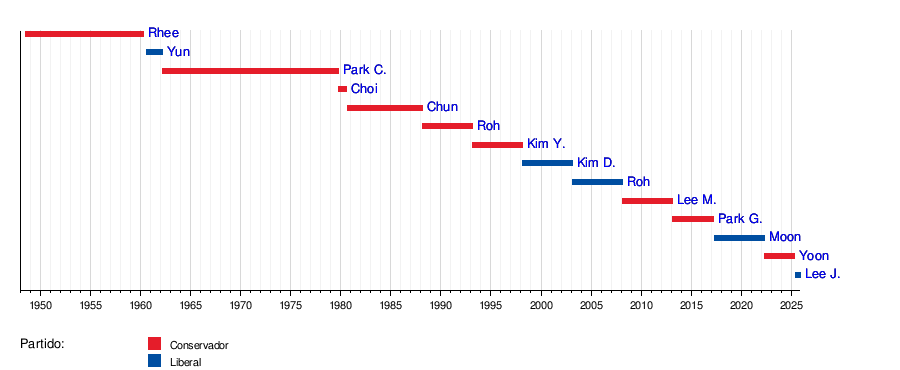 Hasta ahora, Corea del Sur ha tenido 14 presidentes principales. Además, ha habido 6 presidentes temporales, que suelen ser los primeros ministros en funciones.