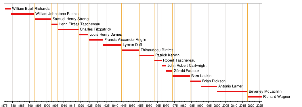 Desde el 18 de diciembre de 2017, Richard Wagner es el actual Presidente de la Corte Suprema de Canadá. Desde que se creó la Corte Suprema en 1875, 18 personas han ocupado este cargo. El primer Presidente fue William Buell Richards. Beverley McLachlin fue la Presidenta que más tiempo estuvo en el cargo. También fue la primera mujer en ocupar esta importante posición.