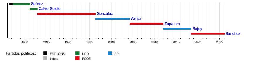 Desde que se aprobó la Constitución española en 1978, España ha tenido siete presidentes del Gobierno diferentes: dos del partido UCD, tres del PSOE y dos del Partido Popular. El presidente que más tiempo ha estado en el cargo ha sido Felipe González (más de 13 años), y el que menos, Leopoldo Calvo-Sotelo (1 año y 9 meses), quien asumió el cargo tras la renuncia de su predecesor.