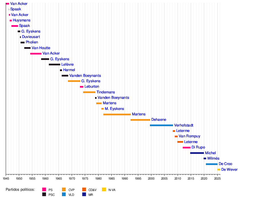 Aquí puedes ver una lista de las personas que han ocupado el cargo de primer ministro de Bélgica a lo largo de los años.
