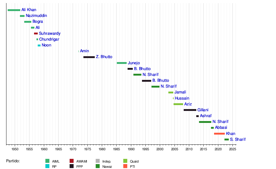 • De 1999 a 2002: Después de un cambio de gobierno liderado por Pervez Musharraf, Pakistán no tuvo primer ministro. Durante este periodo, Musharraf ocupó el cargo de "Jefe del Ejecutivo" y era, en la práctica, el líder del gobierno.