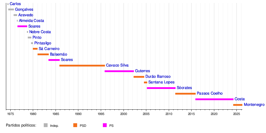 El actual primer ministro es Luís Montenegro, quien asumió el cargo el 2 de abril de 2024. Antes que él, António Costa fue primer ministro desde el 26 de noviembre de 2015 hasta noviembre de 2023.