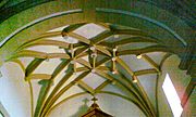 La iglesia tiene una sola nave (el espacio central). El techo está cubierto con bóvedas de estrella, que son muy elaboradas, especialmente en el crucero y el presbiterio. En las paredes hay pilares que sostienen las nervaduras de las bóvedas. En la pared sur se puede ver un escudo que podría ser el de Bartolomé Álvarez de Grado, quien impulsó la construcción del santuario. La torre tenía un corredor de madera que se cayó por un fuerte viento en 1919. El suelo del santuario está hecho con piedras de río de diferentes colores, formando figuras geométricas.