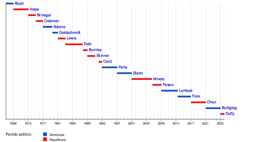Desde que se creó el puesto en 1966, muchas personas han ocupado el cargo de Secretario de Transporte. El primer Secretario fue Alan Stephenson Boyd. Cada uno ha trabajado para mejorar cómo nos movemos en el país.