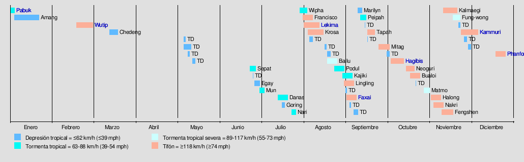 A finales de agosto, se formaron dos tifones que duraron hasta septiembre, ambos alcanzando la categoría 4. Uno fue Lingling, que golpeó la península de Corea. El otro fue Faxai, que causó grandes daños en Japón, estimados en 8.12 mil millones de dólares. Otras depresiones se formaron en septiembre, pero solo "Peipah" fue nombrada por la JMA. A mediados de septiembre, el tifón "Tapah" afectó a Taiwán, Corea del Sur y el oeste de Japón, con daños menores. A finales de septiembre, Mitag también se convirtió en tifón, impactando a Taiwán y Corea del Sur con daños moderados.