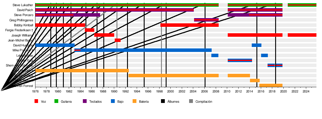David Hungate Bobby Kimball Jeff Porcaro (fallecido) Steve Porcaro Mike Porcaro (fallecido) Fergie Frederiksen (fallecido) Jean-Michel Byron Simon Phillips Keith Carlock |