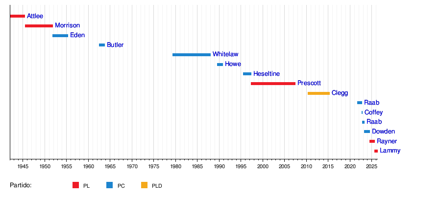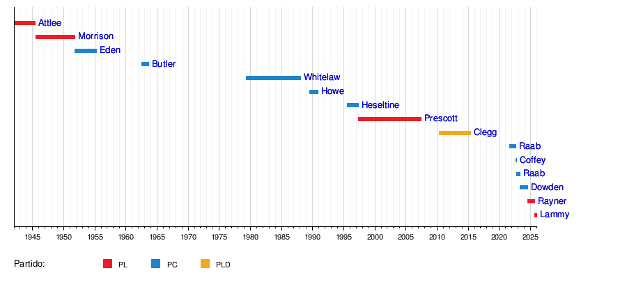 | Nick Clegg | 11 de mayo de 2010 | 8 de mayo de 2015 | Liberal Demócrata | Presidente del Consejo Privado de Su Majestad Ministro para la Reforma Política y Constitucional |